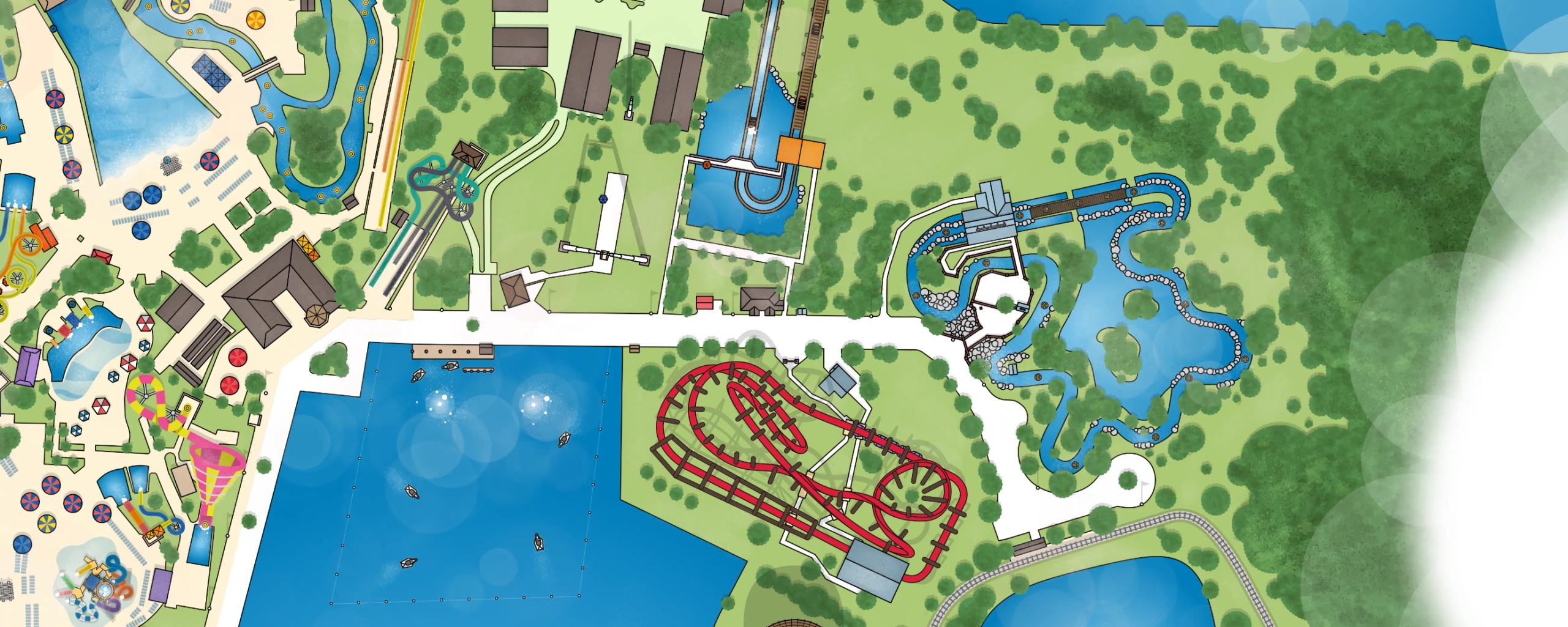 After taking a sharp turn, gravity takes hold, and down, down, down you go, where a large pool waits for you below. SPLASH! The direct impact on the water creates a humongous wave reaching high into the sky and soaking everything in its path, including YOU!